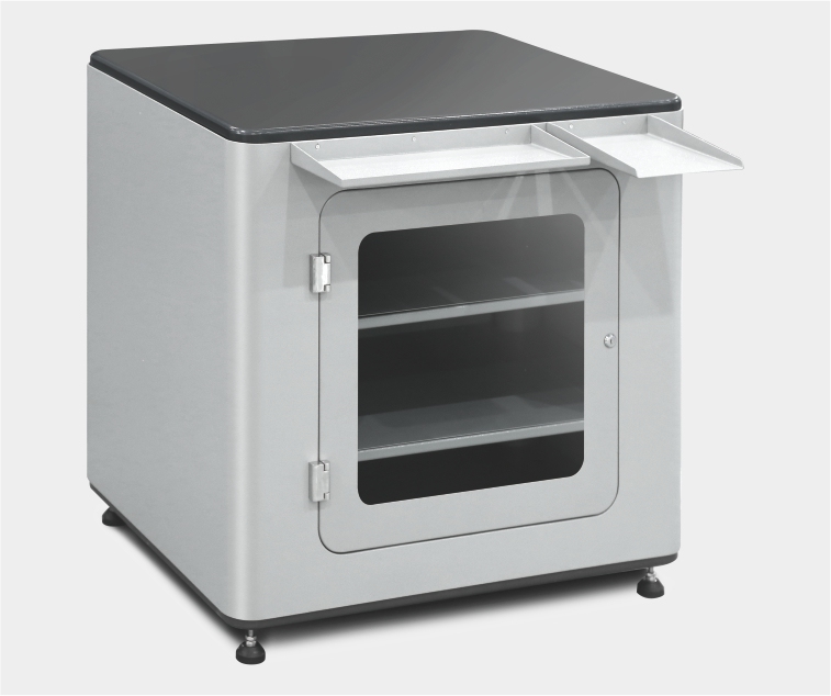Solid standing work station with practical storage space for materials and tools.