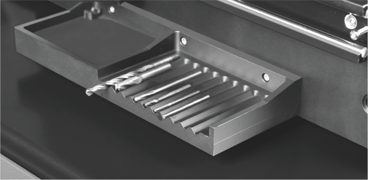 A multiple section tools holder is embedded at the side of the machine for organized tool storage.