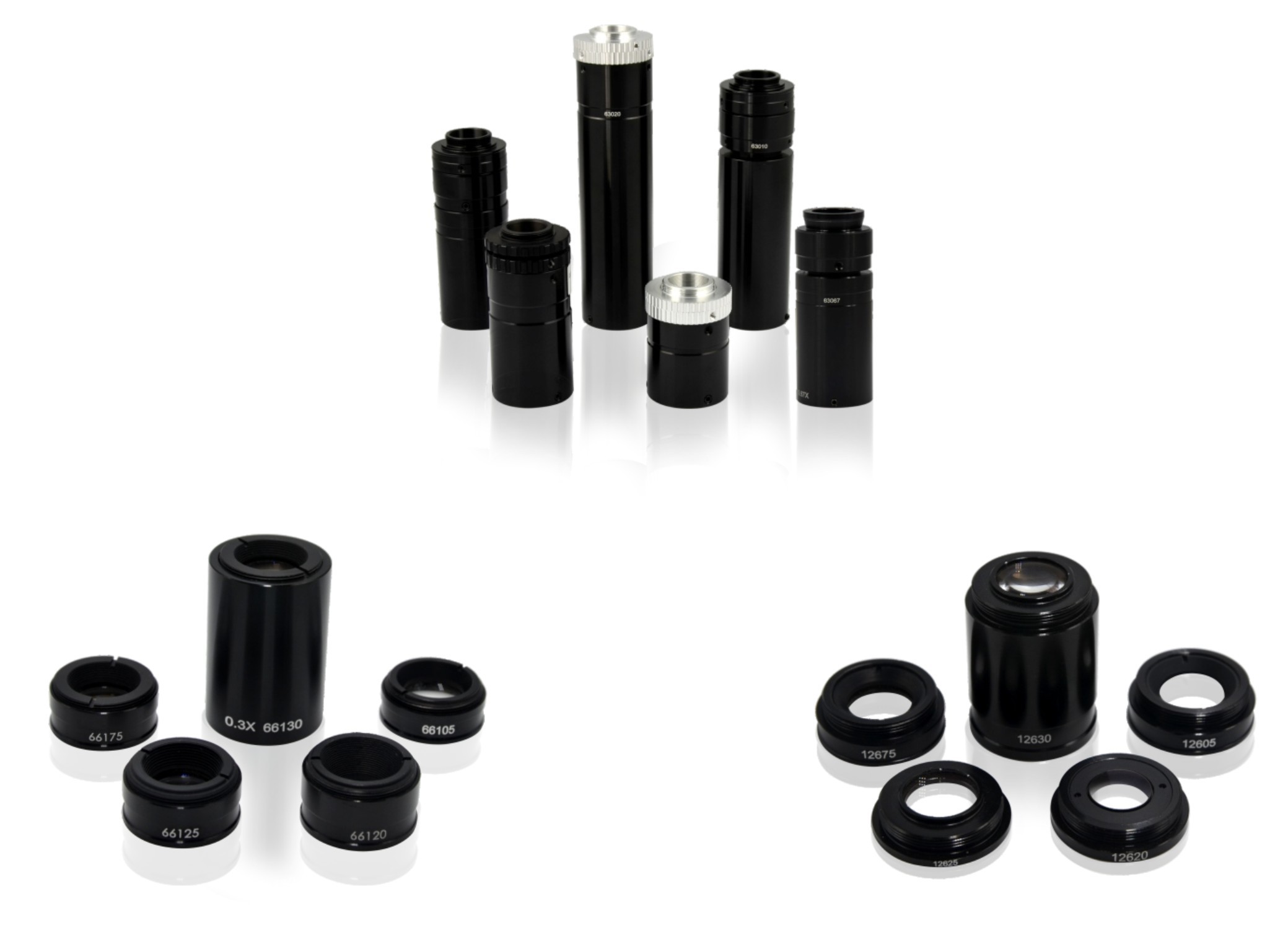 Sistema de lente industrial de baixa distorção com faixa de ampliação de 0,25X a 2X, projetado para aplicações de medição de visão de precisão.