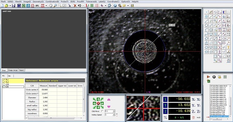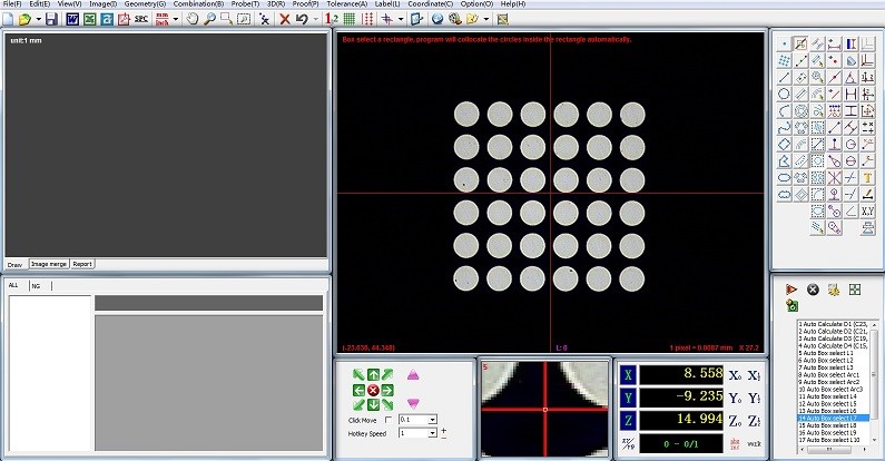 Foco automático, medição automática, medição de matriz e importação de arquivos DXF para comparação com imagens de peças ou gráficos medidos.